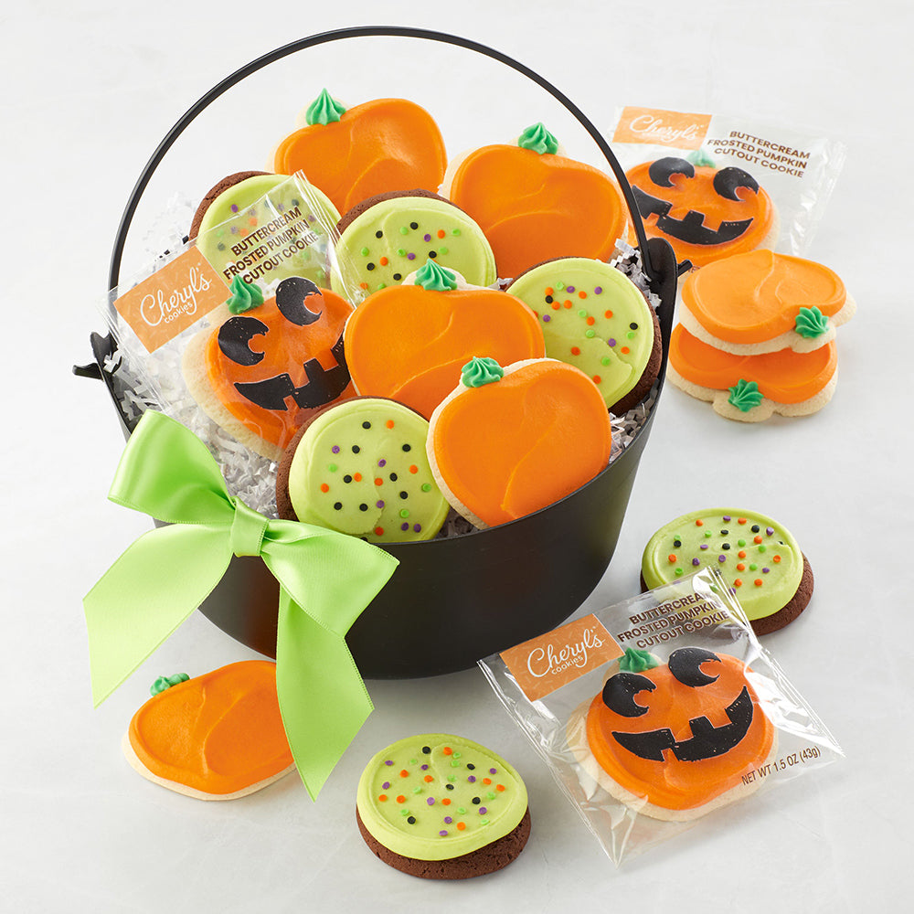 Discover delicious treats that have been conjured up just for you. There are two varieties of our seasonal buttercream-frosted cookies for you to enjoy: colorful Halloween sprinkle and our pumpkin-shaped bestseller that’s tucked into a cute jack-o'-lantern printed sleeve. Serve in the included black plastic cauldron for a wickedly fun display. Enjoy your cookies within 3 to 4 days of receiving or freeze for up to 6 months.